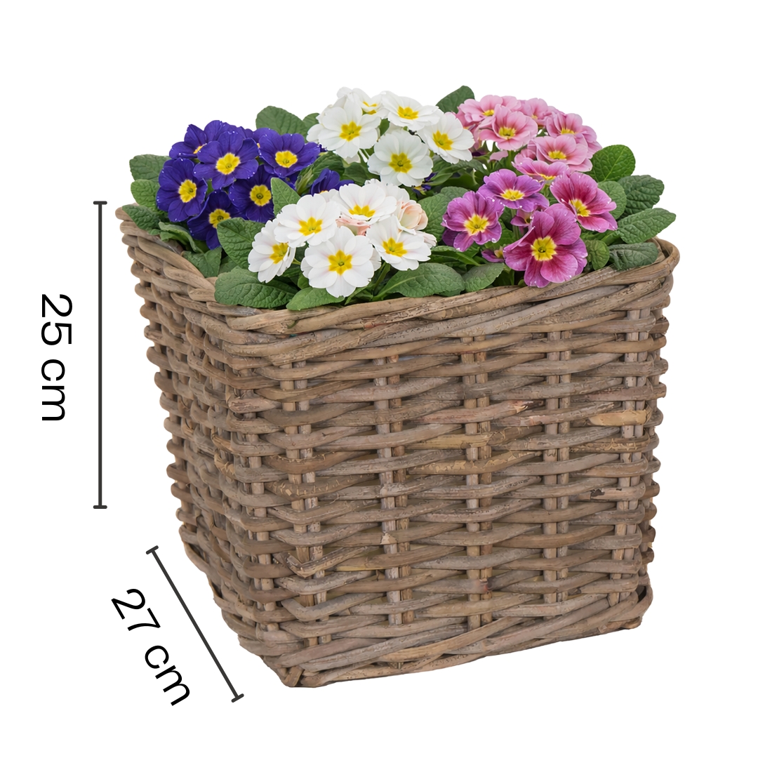 Der quadratische Weidenkorb Landzauber Carlotta verbindet natürliche Materialien mit klarer Form und ist eine stilvolle Lösung zum Bepflanzen. Der Pflanzkorb aus Weide ist innen mit Folie ausgeschlagen und eignet sich ideal als Blumenkorb oder Übertopf für Garten, Balkon oder Terrasse. Durch die quadratische Form wirkt der Weidenkorb besonders modern und passt hervorragend zu geradliniger Gartendeko oder klassischem Landhaus Stil. Die integrierte Folie schützt das Material und sorgt dafür, dass Blumen und Pflanzen nicht austrocknen. So kann der Pflanzkorb direkt bepflanzt oder als dekoratives Pflanzgefäß verwendet werden. Du kannst zwischen zwei Größen wählen. Die kleinere Variante misst 24 cm bei einer Höhe von 19 cm. Die größere Ausführung hat 27 cm und eine Höhe von 25 cm. Beide Körbe eignen sich perfekt für Sommerblumen, Kräuter, kleine Sträucher oder dekorative Arrangements im Außenbereich. Ob als Weidenkorb zum Bepflanzen, als Pflanzgefäß für die Terrasse oder als Balkon Dekoration im Landhausstil – dieser quadratische Pflanzkorb setzt natürliche Akzente und schafft eine harmonische Atmosphäre rund um dein Zuhause.