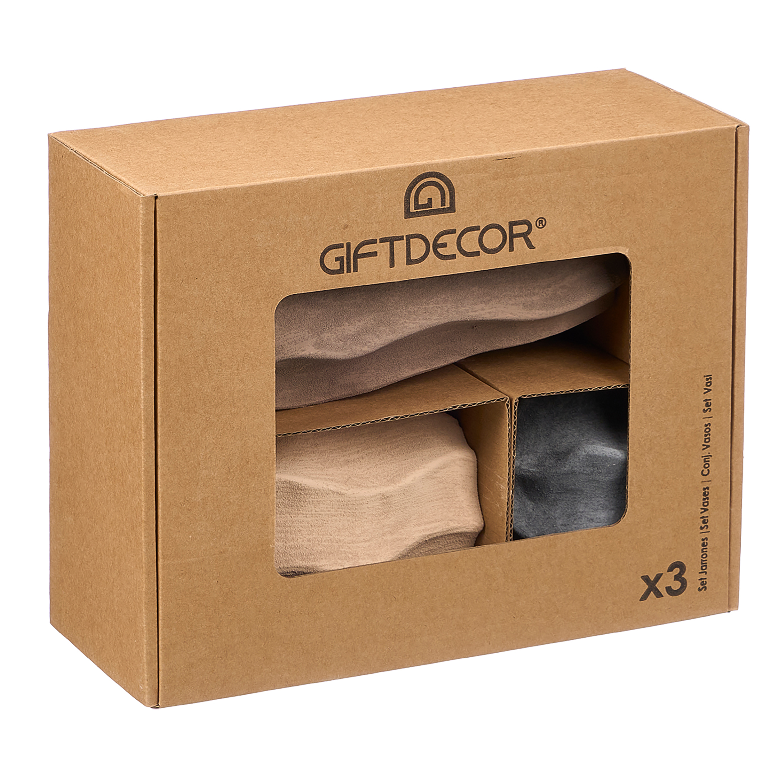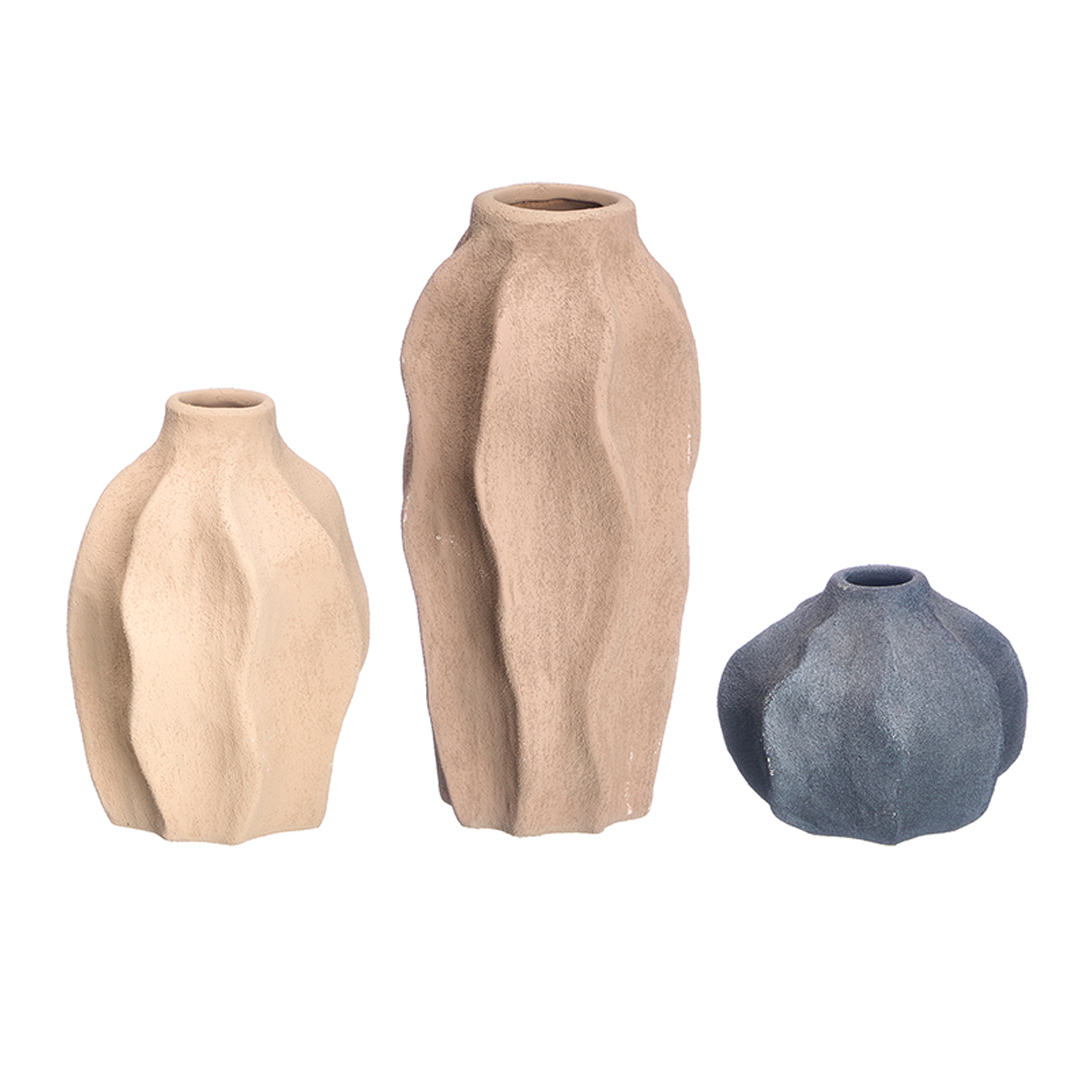 Das 3 teilige Vasen Set Desert Wave Tuareg begeistert mit markantem Wellen Design und außergewöhnlichem Wüsten Look. Inspiriert vom natürlichen Stil der Tuareg verbindet dieses Dekovasen Set strukturierte Oberflächen mit warmen Naturfarben und schafft eine ruhige, erdige Atmosphäre im Wohnraum. Die Vasen haben eine Höhe von 28 cm, 22,5 cm und 11,5 cm und sind in drei harmonisch abgestimmten Naturfarben sortiert. Dadurch entsteht ein stimmiges Gesamtbild, das sich ideal als Ensemble auf Tisch, Sideboard oder Regal arrangieren lässt.Der besondere Wellen Look verleiht jeder Vase eine moderne und zugleich organische Ausstrahlung. Ob im Boho Stil, im Natural Living Ambiente oder als Akzent in minimalistischer Einrichtung – dieses Vasen Set setzt stilvolle Highlights im Wohnzimmer, Essbereich oder Flur. Ideal geeignet für Trockenblumen, Pampasgras oder als dekoratives Element ohne Befüllung, überzeugt dieses 3er Vasen Set durch seine außergewöhnliche Formgebung und den charakteristischen Wüstenstil. Wer moderne Dekovasen mit Struktur sucht, findet hier eine ausdrucksstarke Ergänzung für zeitgemäße Wohnkonzepte.
