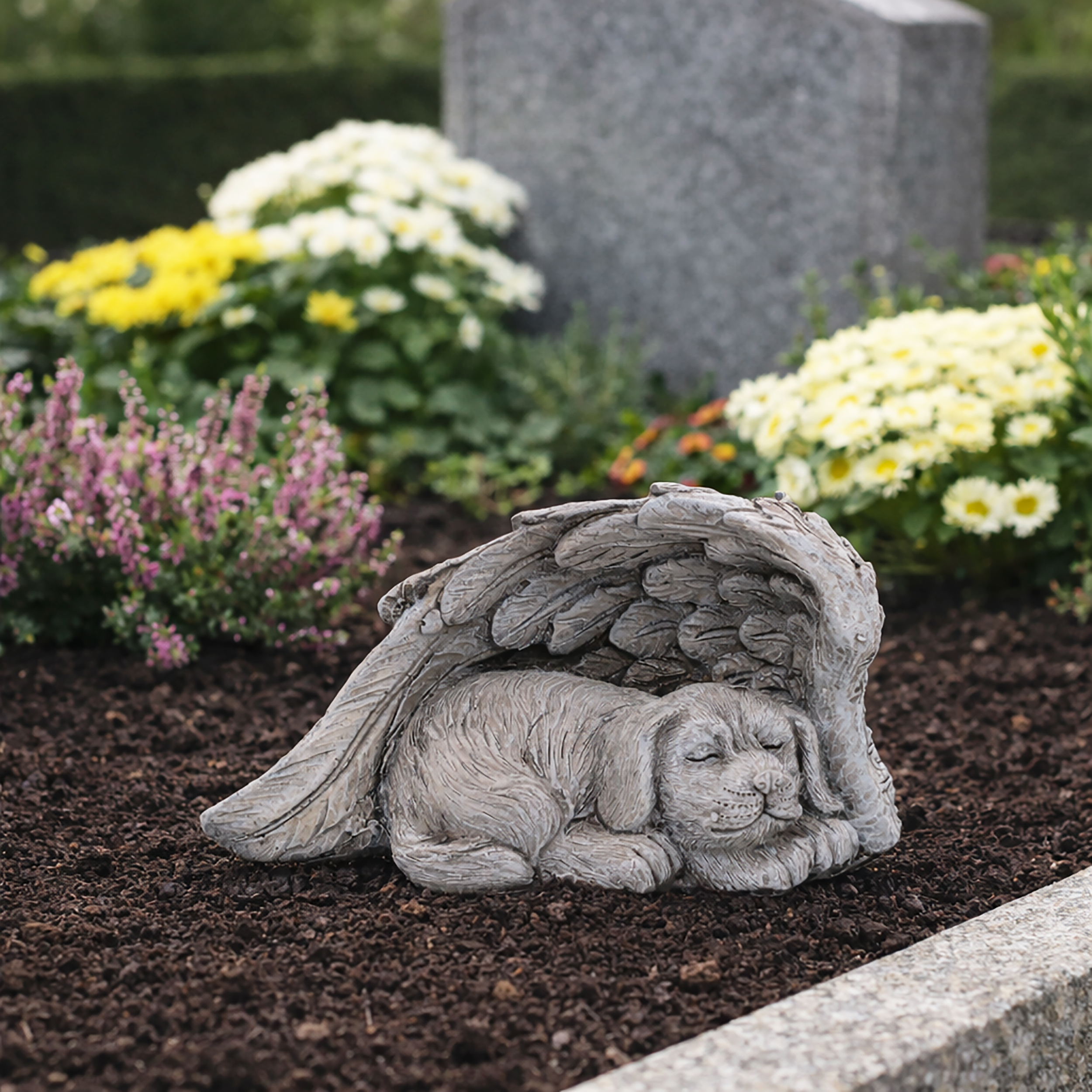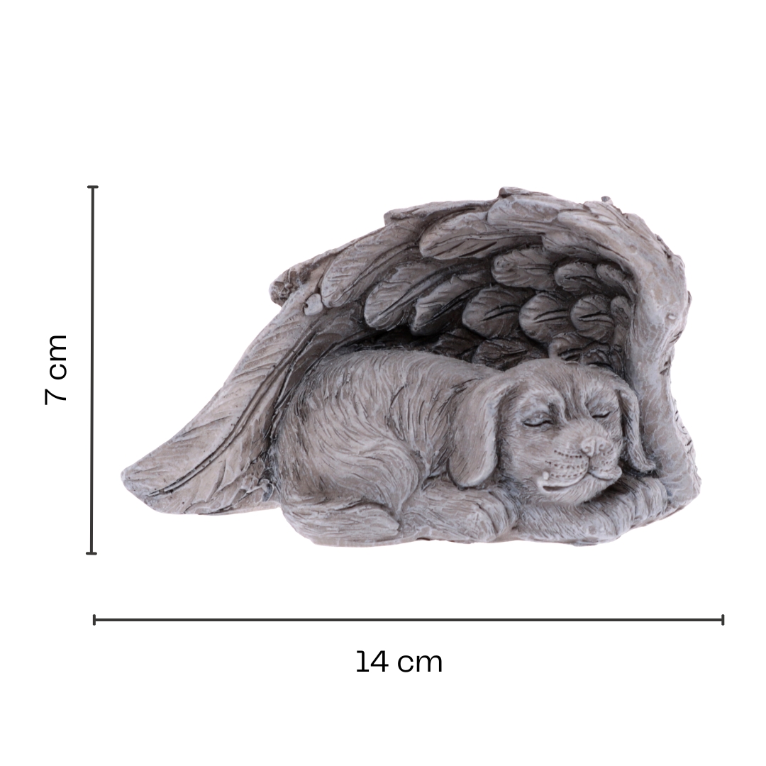 Diese Grabdeko ist eine würdevolle Erinnerung an einen geliebten Vierbeiner. Die Figur zeigt einen Hund, der liebevoll von Flügeln umgeben ist, und symbolisiert Schutz, Verbundenheit und bleibende Erinnerung. Gefertigt aus wetterfestem Polyresin eignet sich die Gedenkfigur ideal für den dauerhaften Einsatz im Außenbereich. Ob auf einem Hundegrab, im Garten oder an einer persönlichen Erinnerungsstelle – diese Grabfigur setzt ein stilles und respektvolles Zeichen. Das detailreiche Design macht die Grabdeko Hund mit Flügeln zu einem besonderen Blickfang, ohne aufdringlich zu wirken. Sie fügt sich harmonisch in jede Grabgestaltung ein und vermittelt Trost sowie Wertschätzung. Wer eine wetterfeste Gedenkfigur für ein Tiergrab sucht, findet mit dieser Polyresin Figur eine stilvolle und langlebige Lösung für eine liebevolle Erinnerung im Außenbereich.