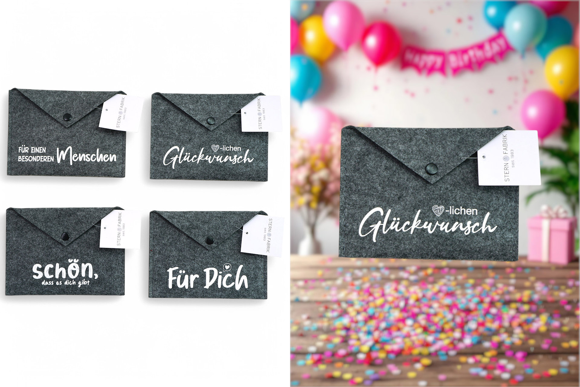 Die Filz Umschläge Filzgruß Leni sind eine stilvolle und kreative Lösung für Geldgeschenke und Gutscheine. Mit einem Maß von 19 x 13 cm bieten die Umschläge ausreichend Platz für Geldscheine, Gutscheinkarten oder kleine Botschaften. Das 4er Set enthält vier Umschläge mit unterschiedlichen Sprüchen, die jedem Geschenk eine persönliche Note verleihen. Das weiche Filz Material sorgt für eine angenehme Haptik und unterstreicht den hochwertigen Charakter dieser Geschenkverpackung. Ob zur Hochzeit, zum Geburtstag, zu Weihnachten oder als kleine Aufmerksamkeit – diese Filz Umschläge sind vielseitig einsetzbar und machen aus einem Geldgeschenk eine liebevolle Überraschung. Wer Umschläge für Geldgeschenke sucht, die praktisch und dekorativ zugleich sind, findet mit diesem Filz Set eine moderne und stilvolle Geschenkidee.