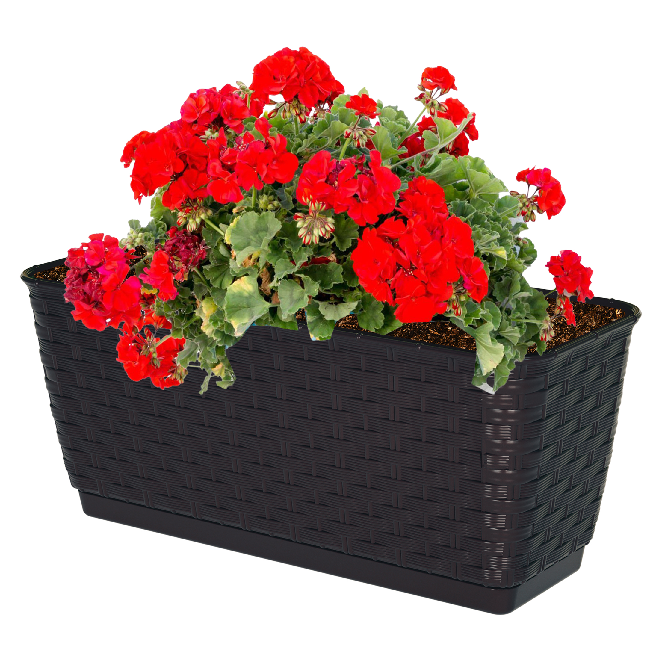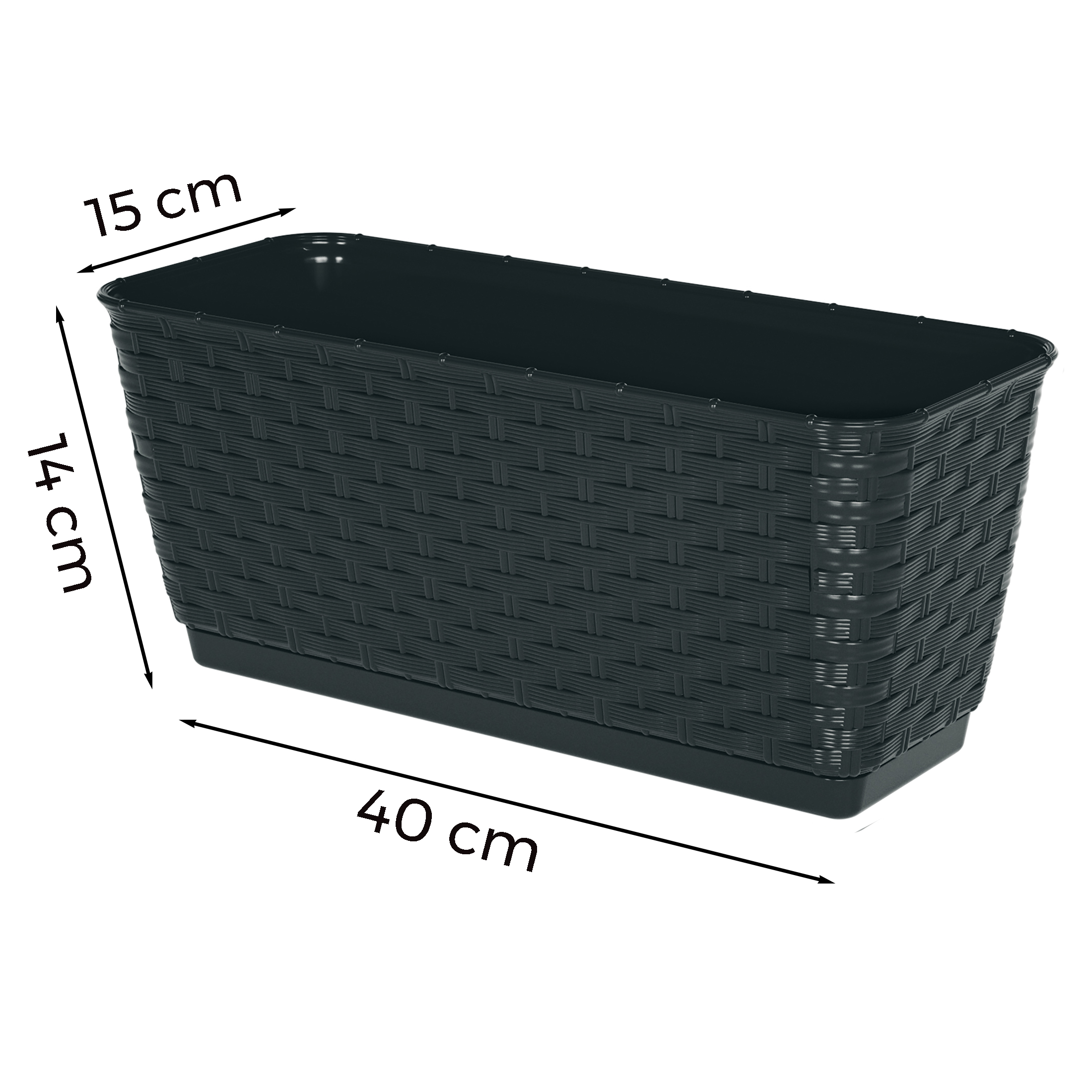 Dieser moderne Balkonkasten besteht aus einem hochwertigen Kunststoff in dekorativer Rattan-Optik und kann direkt bepflanzt werden. Er verfügt über einem integrierten Untersetzer, welcher mit einem Stecksystem am Topf befestigt wird und ganz einfach durch Ziehen abgenommen werden kann. Im Boden des Blumentopfes befinden sich mehrere angedeutete Lochungen, um nach Belieben Überlauflöcher zu bohren. Diese Sorgen für den Ablauf des überschüssigen Wassers und gewährleisten die Sauerstoffzufuhr für die Wurzeln. Mit diesem modernen Balkonkasten aus hochwertigem Kunststoff erhalten Sie nicht nur ein optisch ansprechendes Produkt, sondern auch eine praktische Lösung für Ihre Bepflanzungsbedürfnisse. Der integrierte Untersetzer ermöglicht es Ihnen, den Kasten direkt zu bepflanzen und bietet somit eine einfache Handhabung. Durch das Stecksystem kann der Untersetzer problemlos abgenommen werden. Darüber hinaus verfügt dieser Blumentopf über angedeutete Lochungen im Boden, die es Ihnen erlauben, je nach Bedarf Überlauflöcher anzubringen. Dadurch wird gewährleistet, dass überschüssiges Wasser ordnungsgemäß abläuft und die Wurzeln mit ausreichend Sauerstoff versorgt werden. Dieser Balkonkasten vereint also sowohl ästhetisches Design als auch funktionale Eigenschaft auf geschickte Weise - ein absolutes Muss für jeden Gartenliebhaber! Erhältlich ist der Balkonkasten mit passenden Untersetzern in verschiedenen Größen sowie Designs und Farben. Egal ob auf dem Balkon oder der Terrasse platziert oder sogar als Blickfang auf Fensterbänken oder im Wintergarten verwendet – dieses Produkt setzt Akzente und lässt Ihren grünen Daumen erstrahlen. Der moderne Balkonkasten aus hochwertigem Kunststoff in toller Optik überzeugt nicht nur optisch, sondern auch durch seine praktischen Eigenschaften.