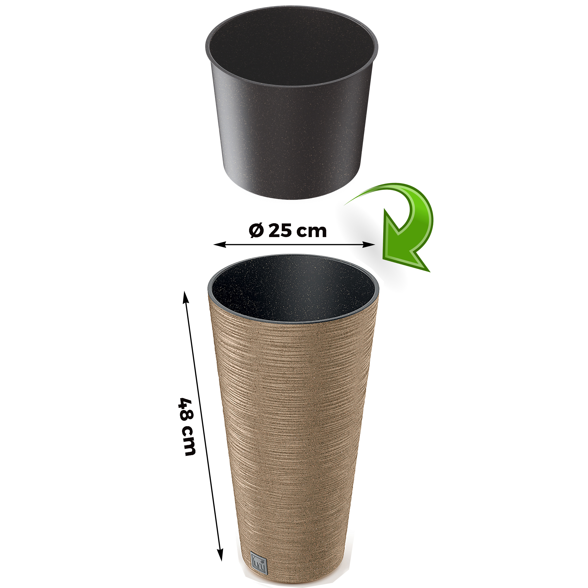 Diese Pflanzsäule sorgt für eine angenehme Atmosphäre in Ihrem Heim und Garten. Durch die verschiedenen Größen lässt er sich auch sehr schön gruppieren. Den Kunststoffeinsatz können Sie bequem herausheben, die Pflanzschale lässt sich so sehr einfach bepflanzen und Sie müssen nicht den gesamten Blumenkübel befüllen. Dadurch ersparen Sie sich das mühsame Befüllen des gesamten Blumenkübels. Das natürliche Aussehen, das durch die holzähnliche Struktur erreicht wird, verleiht der Einrichtung einen Boho-Stil. Die Blumentöpfe der Serie Furu verbinden Eleganz und Schlichtheit mit Modernität. Dank der attraktiven Farben passen sie in jeden Raum. Sie schmücken sowohl das Innere des Hauses oder Büros als auch die Terrasse oder den Balkon perfekt. Die Pflanzsäule ist nicht nur ein Blickfang für Ihr Zuhause und Ihren Garten, sondern sorgt auch für eine angenehme Atmosphäre. Diese Töpfe sind aus stabilem Kunststoff gefertigt, wodurch sie leicht, witterungsbeständig und langlebig sind. Trotz ihrer speziellen Oberfläche gestaltet sich ihre Reinigung äußerst einfach. Dank ihrer klassischen Formen sowie gedeckten Farben kommen darin gepflanzte Gewächse besonders schön zur Geltung.